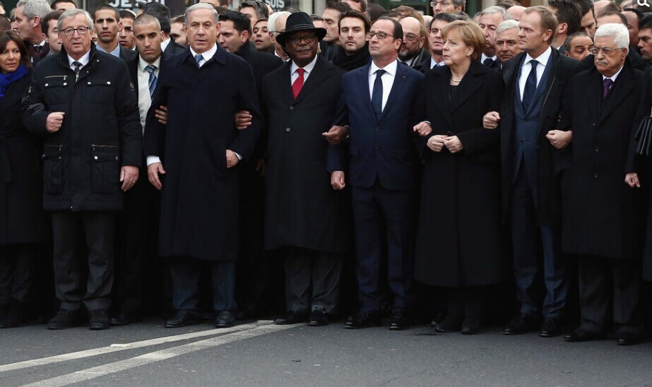 欧盟主席容克、以色列总理内塔尼亚胡、马里总统凯塔、法国总统奥朗德、德国总理默克尔、欧洲理事会主席图斯克、巴勒斯坦总统阿巴斯(从左到右)等众多政要走在前列。