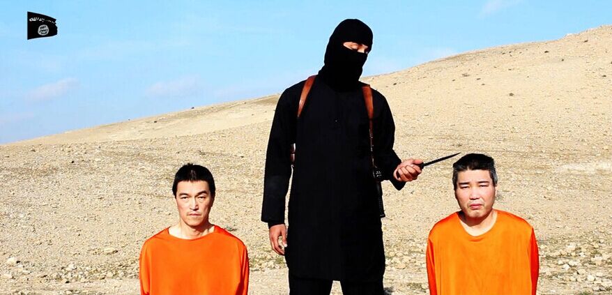 视频中,以黑衣黑布覆盖全身的持刀男子挟持着2名身着橙色衣物跪地的男子。视频称其中一人名叫汤川,另一人名为KENJI?GOTOU?JYOGO。