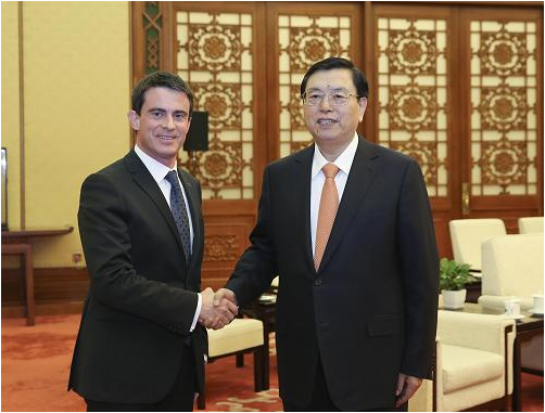 张德江说,去年习近平主席成功访法,同奥朗德总统共同决定开创紧密持久的中法全面战略伙伴关系新时代,两国各领域合作取得新成果。双方成功举办了建交50周年系列庆祝活动,谱写了两国交流互鉴新篇章。中国全国人大愿继续同法国议会保持密切友好合作,充分发挥定期交流机制和友好小组等平台作用,加强立法等领域交流,为推动两国务实合作和人员往来创造良好条件,共同推动中法关系向前发展。