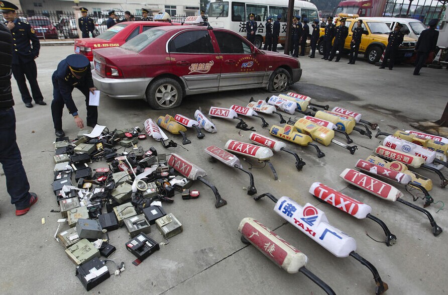当日,在张槎一路的交警支队高速大队车辆保管场,35台假出租车整齐地排在一起,在旁边,还有一堆计价器、车灯。从外观上看,这些假出租车与真车并无两样,甚至连车身上的电召电话,都是今年7月佛山最新推出的统一电召。图为查获的假出租车设备。