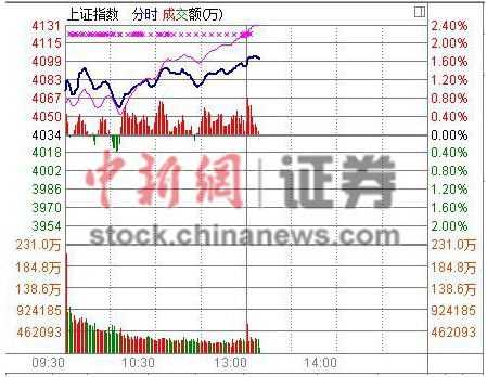 4月13日电 A股午后继续窜高,沪指涨超1.7%,冲上4100点关口,再度刷新7年多新高纪录。