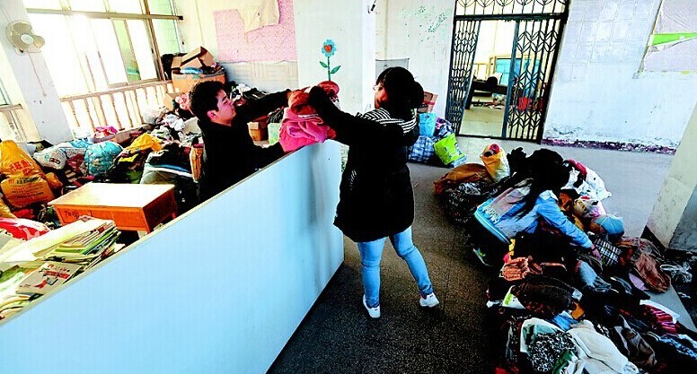 午休时间,整理爱心人士捐赠的衣物。