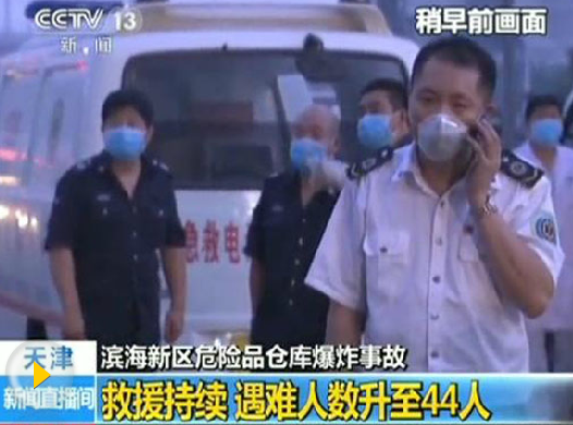 天津爆炸事故死亡人数增至44人 含12名消防官兵