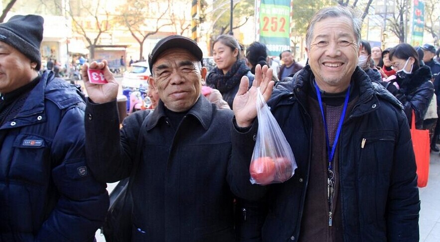 2014年12月23日,郑州二七路一珠宝广场,200多位市民排起了数十米长队,拿着苹果等待换黄金。据介绍,为了迎圣诞节,凡持一对苹果到金鑫珠宝正弘店,即可免费兑换迷你“招财金”小金条一个。